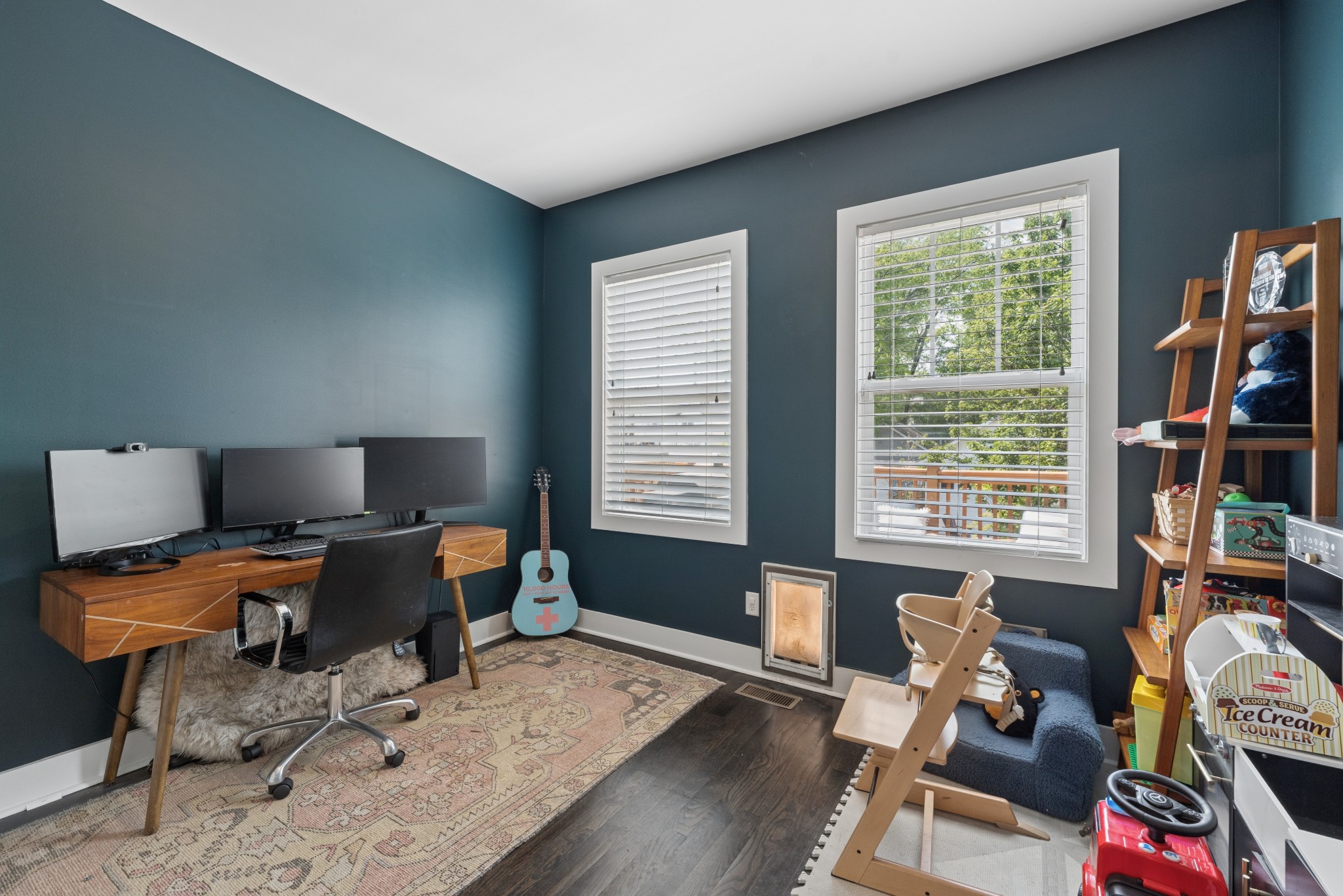 Very unique attached home- only attached by lower bathroom wall. The property features 3 bedrooms, 3 full bathrooms, and 1 half bath. The main level includes a bedroom and full bath (non-ensuite), ideal for guests or a private office.