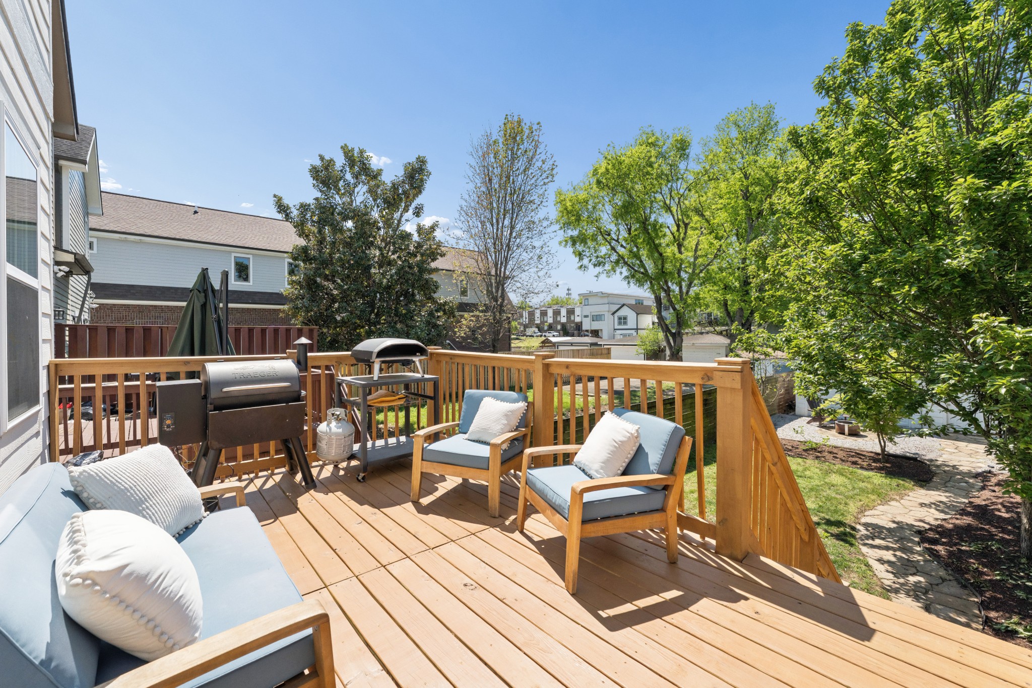 Upstairs, the primary suite offers a steam shower and a private balcony with elevated views, alongside a third bedroom with its own ensuite bath and laundry room. Newly painted front fence and deck and newly painted backyard deck.